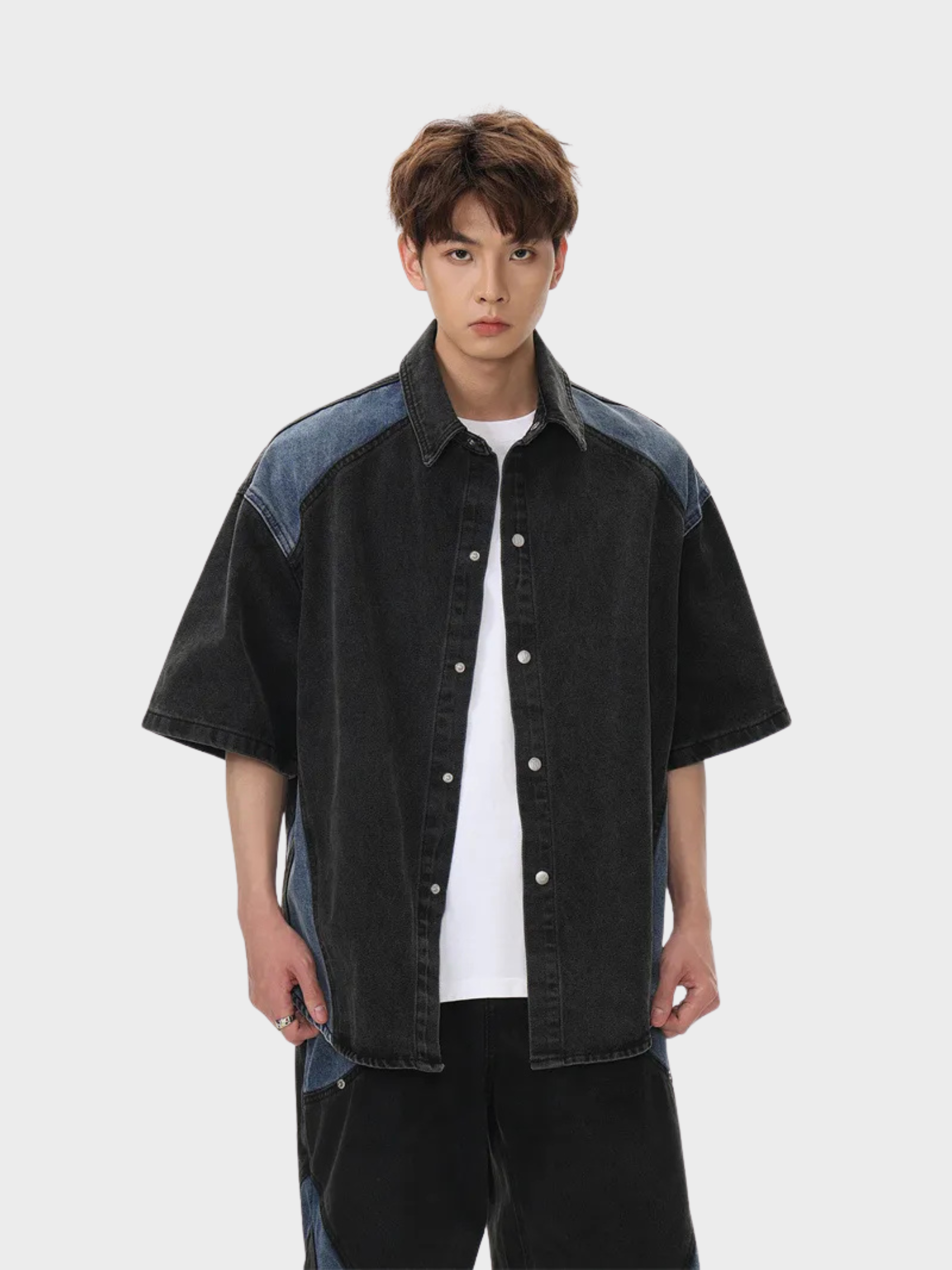 • Short-sleeve button-up shirt + matching denim shorts for a bold two-piece look