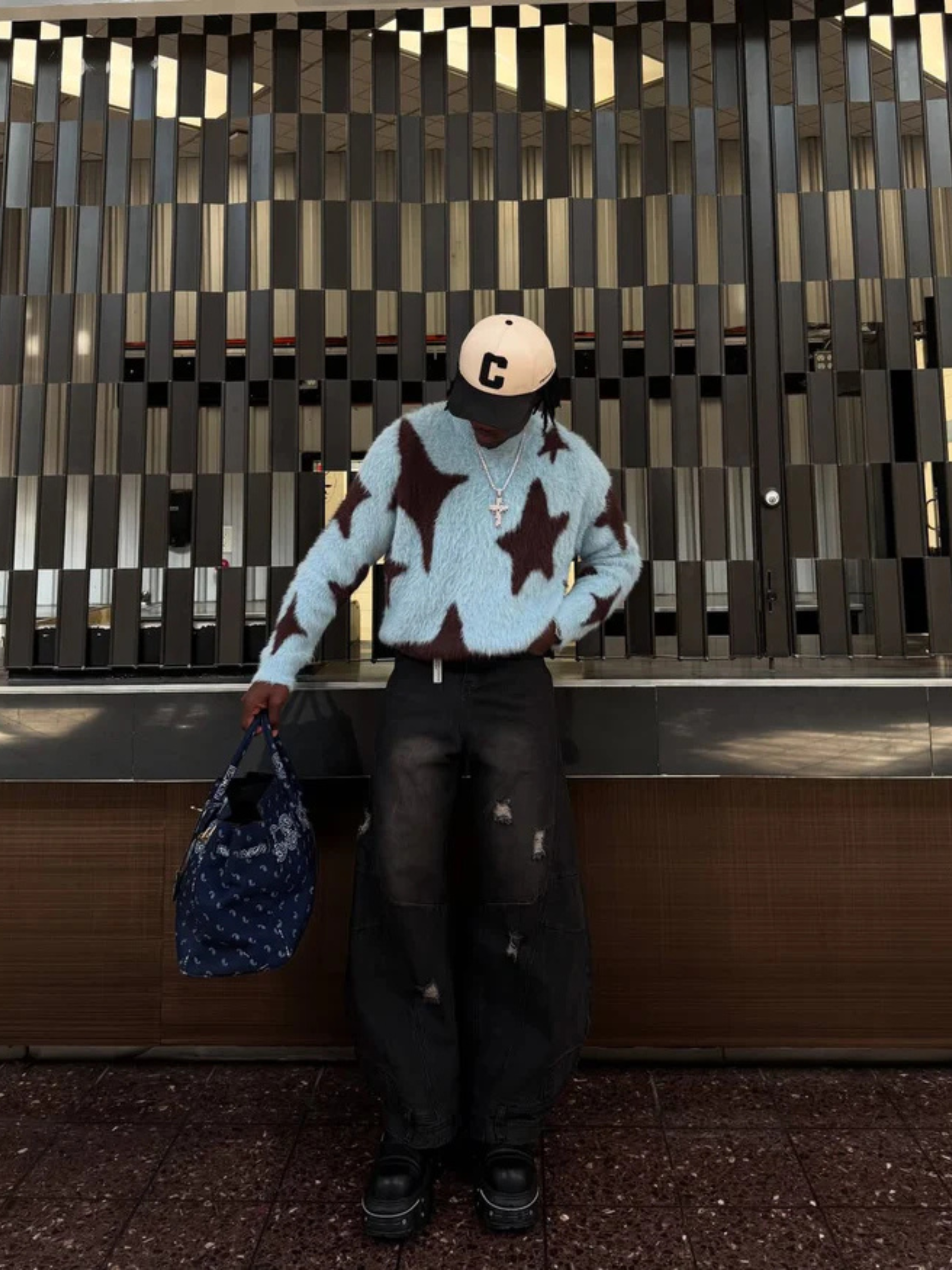 Featuring oversized star motifs woven directly into the fabric, it blends cozy comfort with a statement graphic look — perfect for winter layering or leveling up your fit with zero effort.